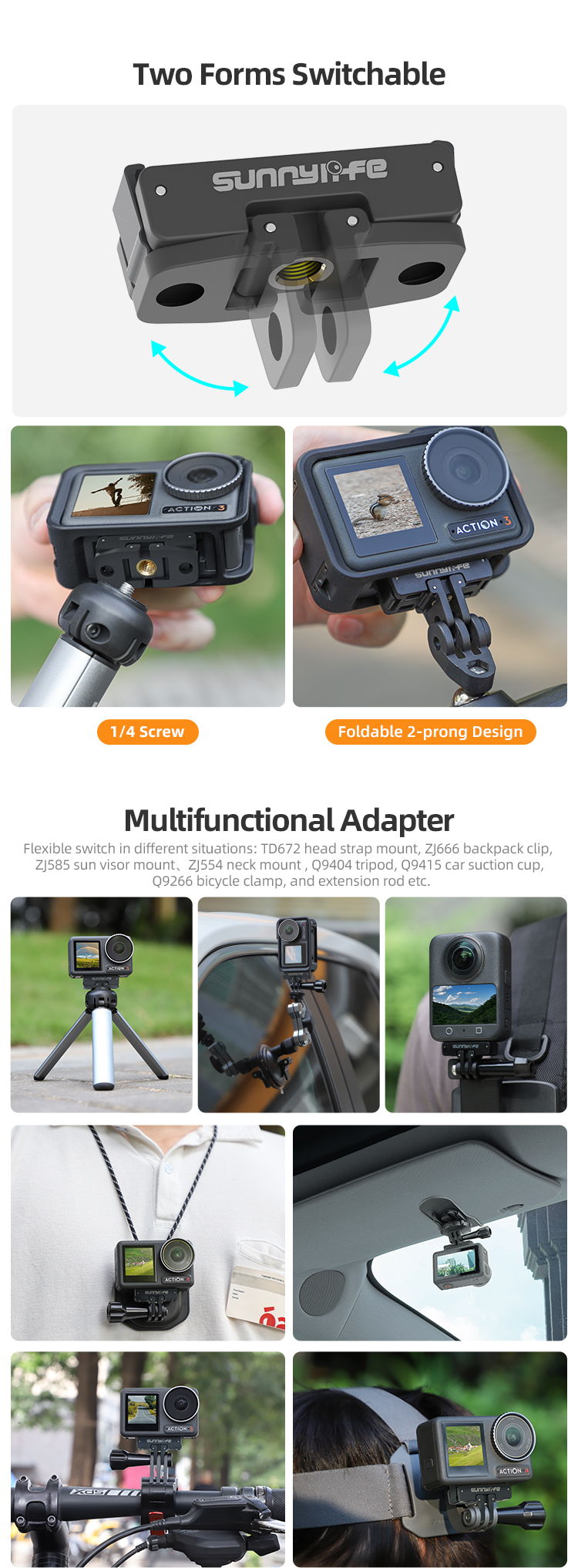 - Multifunctional Adapter. Flexible switch in different situations: TD672 head strap mount, ZJ666 backpack clip, ZJ585 sun visor mount、ZJ554 neck mount , Q9404 tripod, Q9415 car suction cup, and Q9266 bicycle clamp, extension rod, etc.