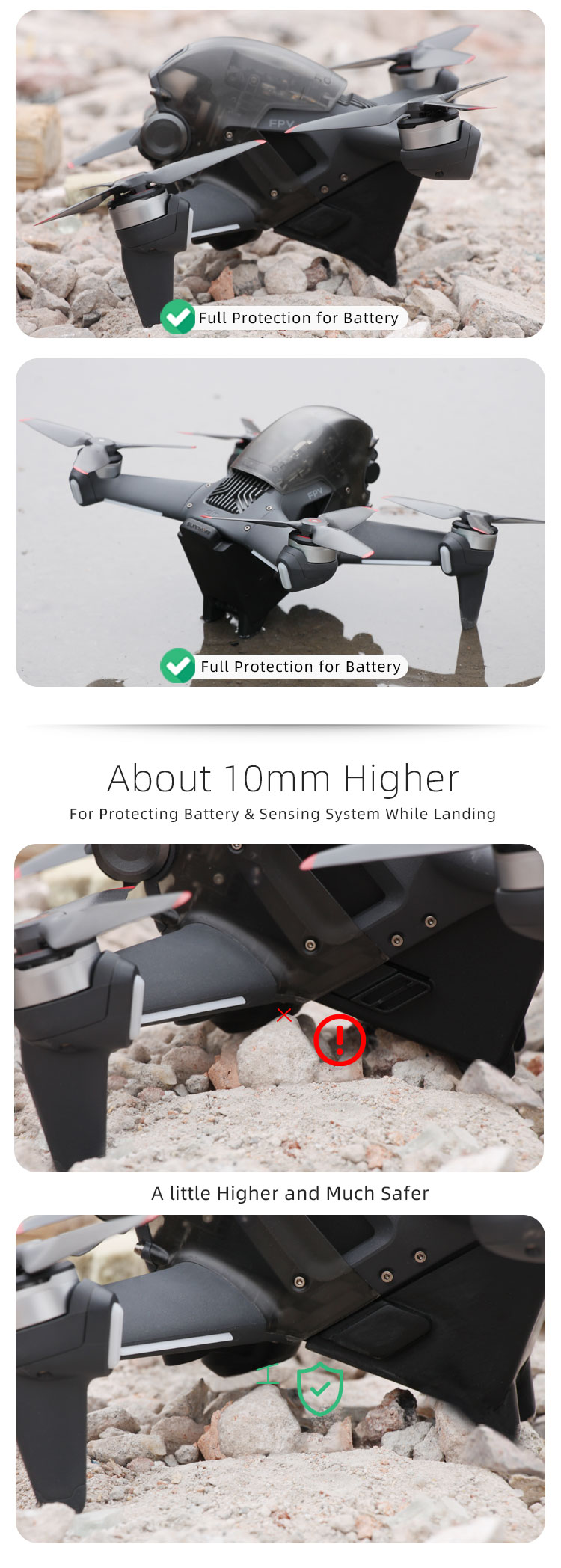 -About 10mm higher for protecting battery and sensing system while landing. Keep drone and battery clean and safe.