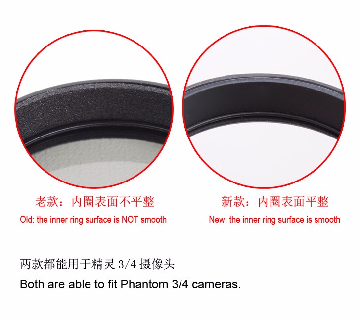 Note: the filter fits Phantom 3/4 cameras, and the initial installation would be a little bit tight for Phantom 3 camera.