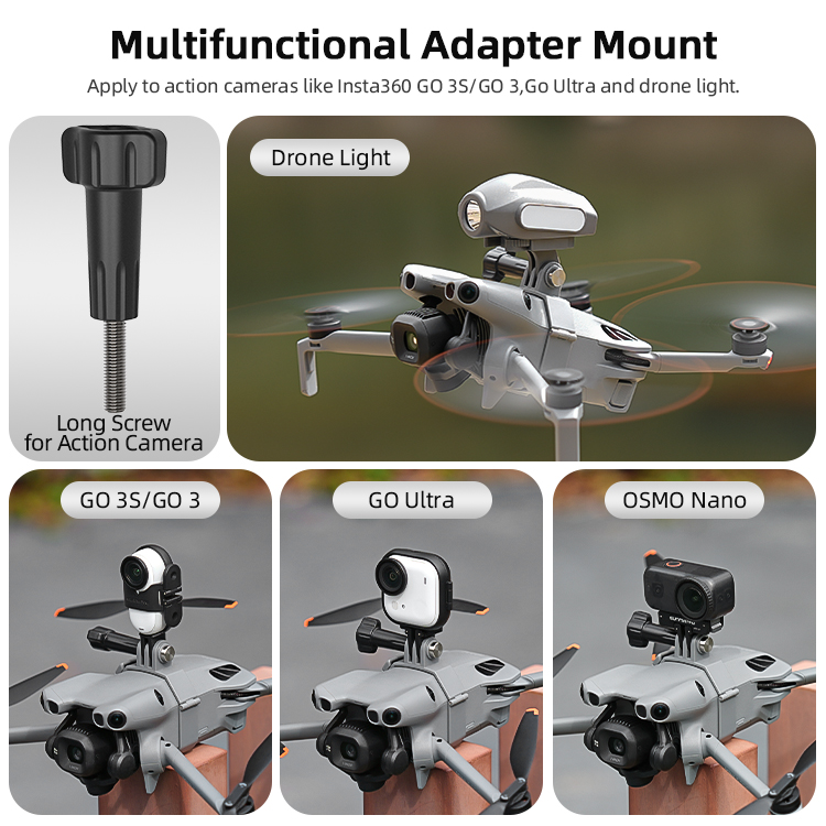 - Multifunctional Adapter Mount. Apply to action cameras like Insta360 GO 3S/GO 3,Go Ultra and drone light.