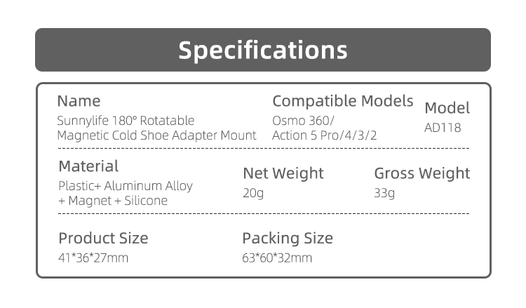 Name: Sunnylife 180° Rotatable Magnetic Cold Shoe Adapter Mount