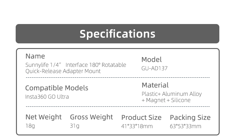 Name: Sunnylife 1/4” Interface 180° Rotatable Quick-Release Adapter Mount