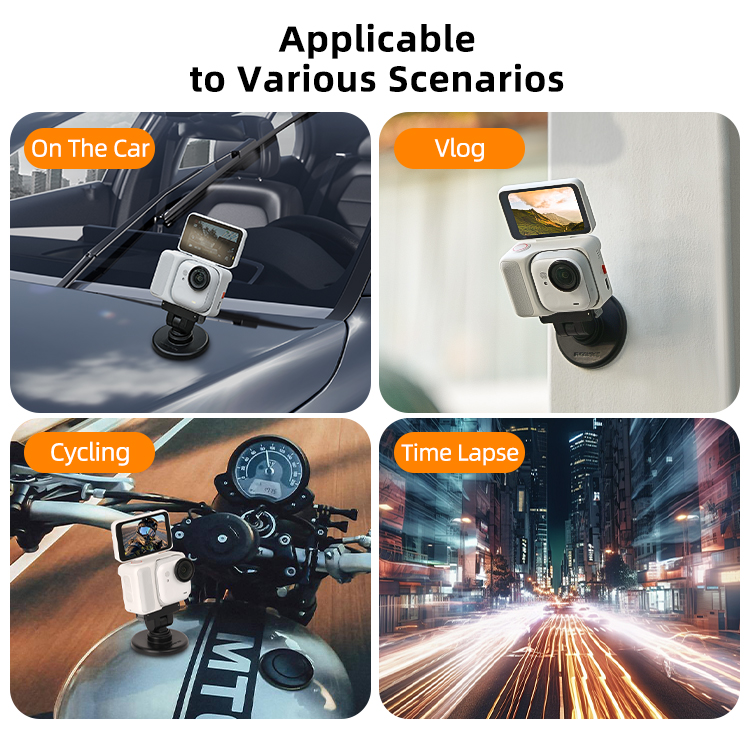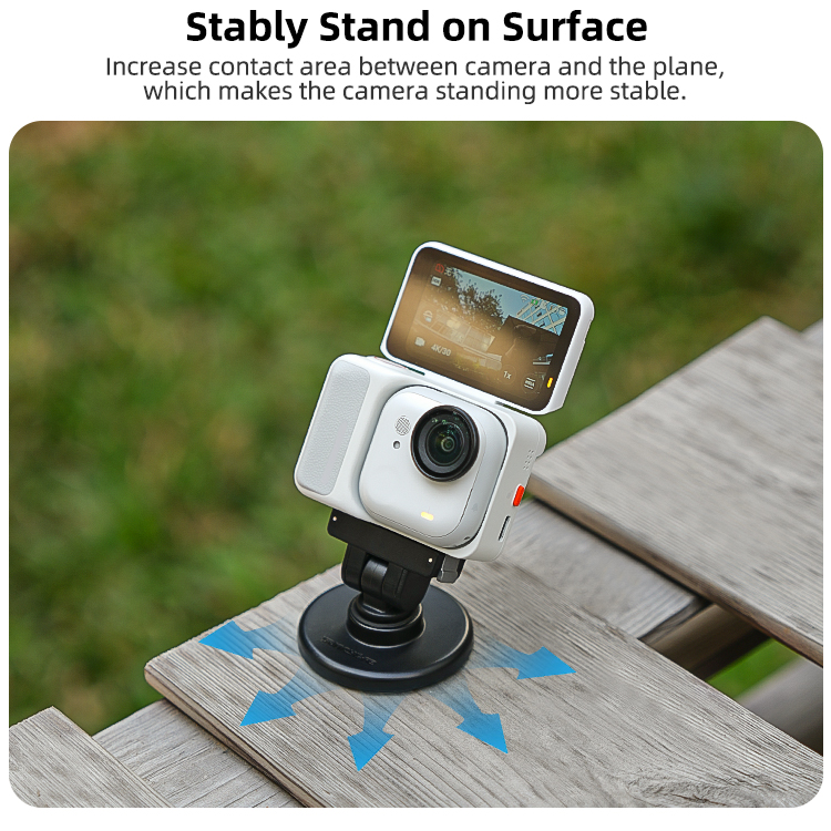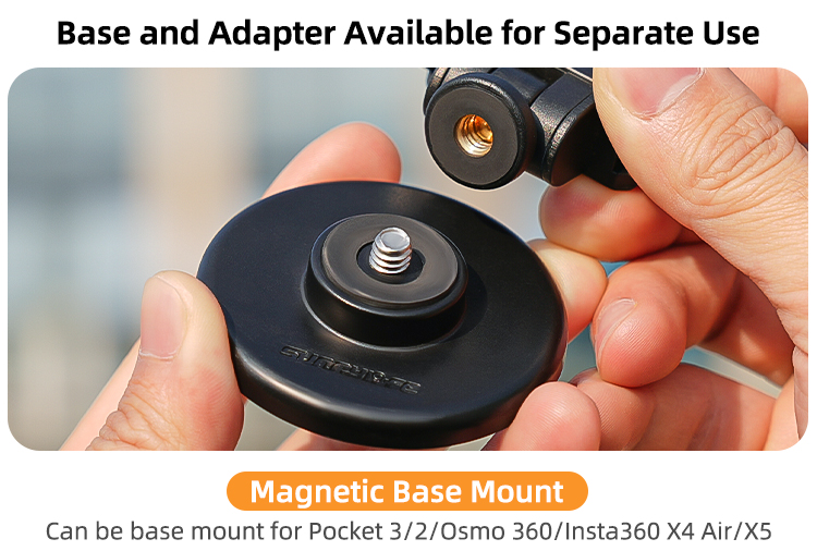 - The base and adapter are available for separate use. The magnetic base mount can be base mount for various action cameras, and the adapter can use with selfie stick, tripod and other 1/4” threaded accessories.