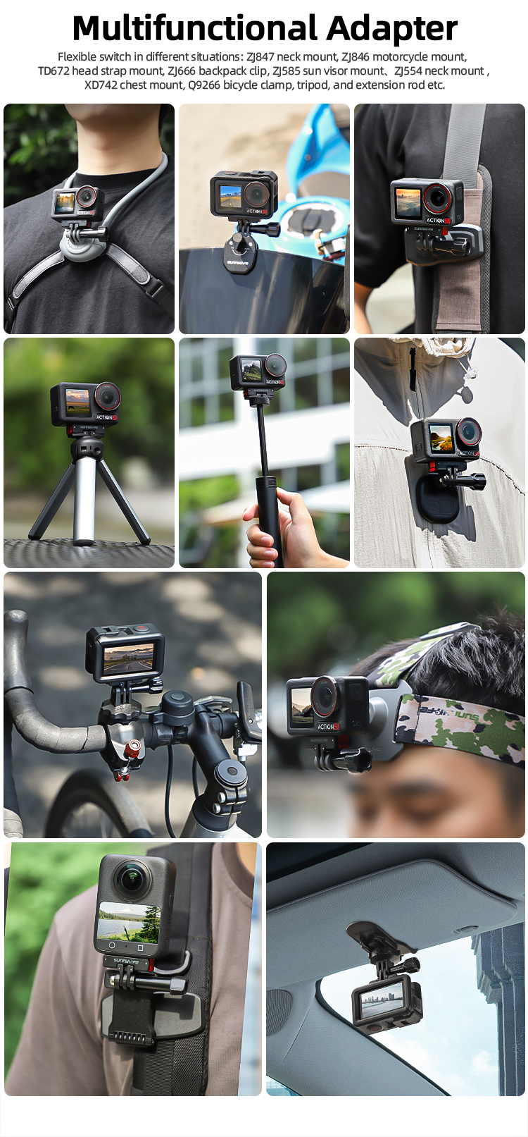 - Multifunctional Adapter. Flexible switch in different situations: ZJ847 neck mount, ZJ846 motorcycle mount, TD672 head strap mount, ZJ666 backpack clip, ZJ585 sun visor mount、ZJ554 neck mount , XD742 chest mount, Q9266 bicycle clamp, tripod, and extension rod etc.