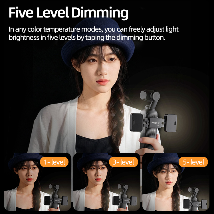 - 3 Color Light & 5 Level Dimming. Long press to adjust 3 color light: cold light - warm light - natural light - off. Short press to cycle through five brightness levels.