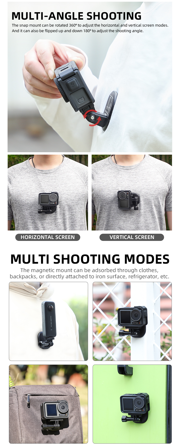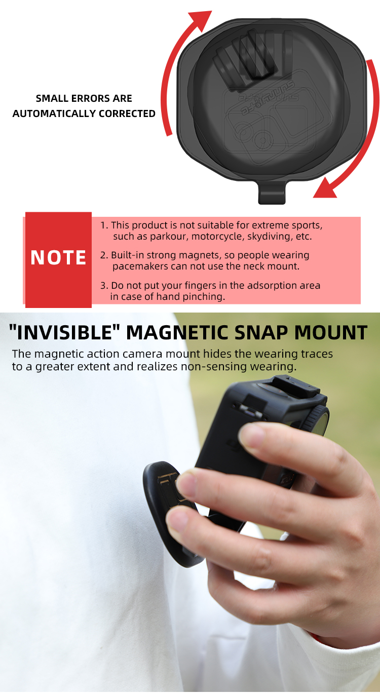 - "Invisible" Magnetic Snap Mount. The magnetic action camera mount hides the wearing traces to a greater extent and realizes non-sensing wearing.