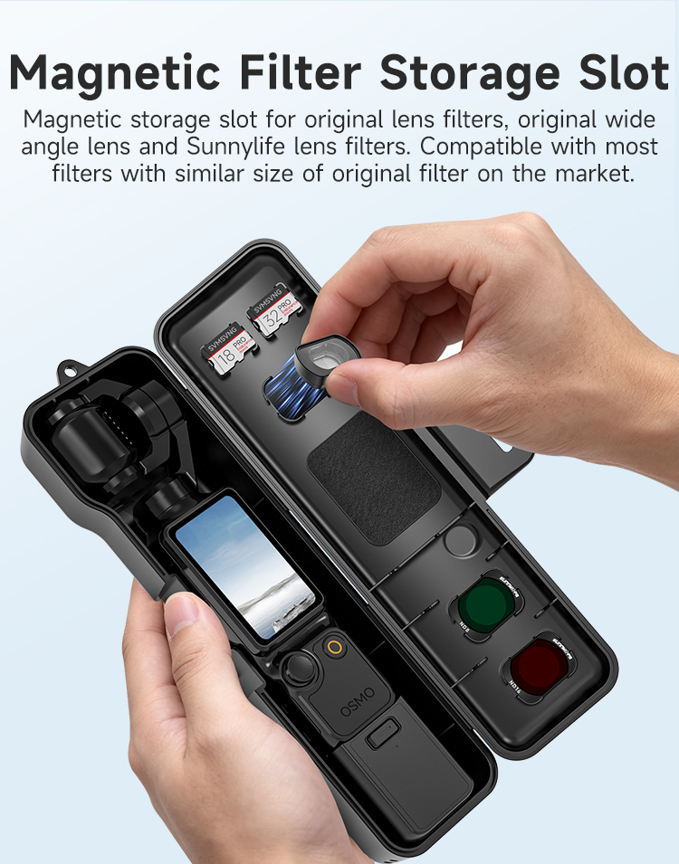 - Magnetic storage slot for original lens filters, original wide angle lens and Sunnylife lens filters. Compatible with most filters with similar size of original filter on the market.