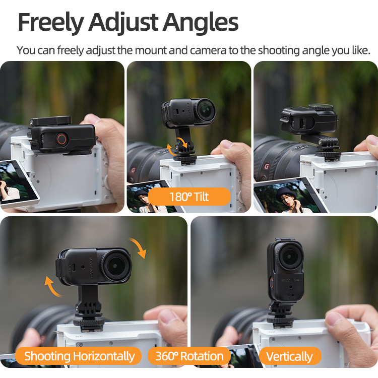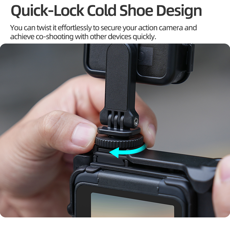- Quick-Lock Cold Shoe Design. You can twist it effortlessly to secure your action camera and achieve co-shooting with other devices quickly.