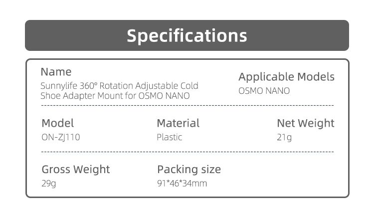 Name: Sunnylife 360° Rotation Adjustable Cold Shoe Adapter Mount for OSMO NANO