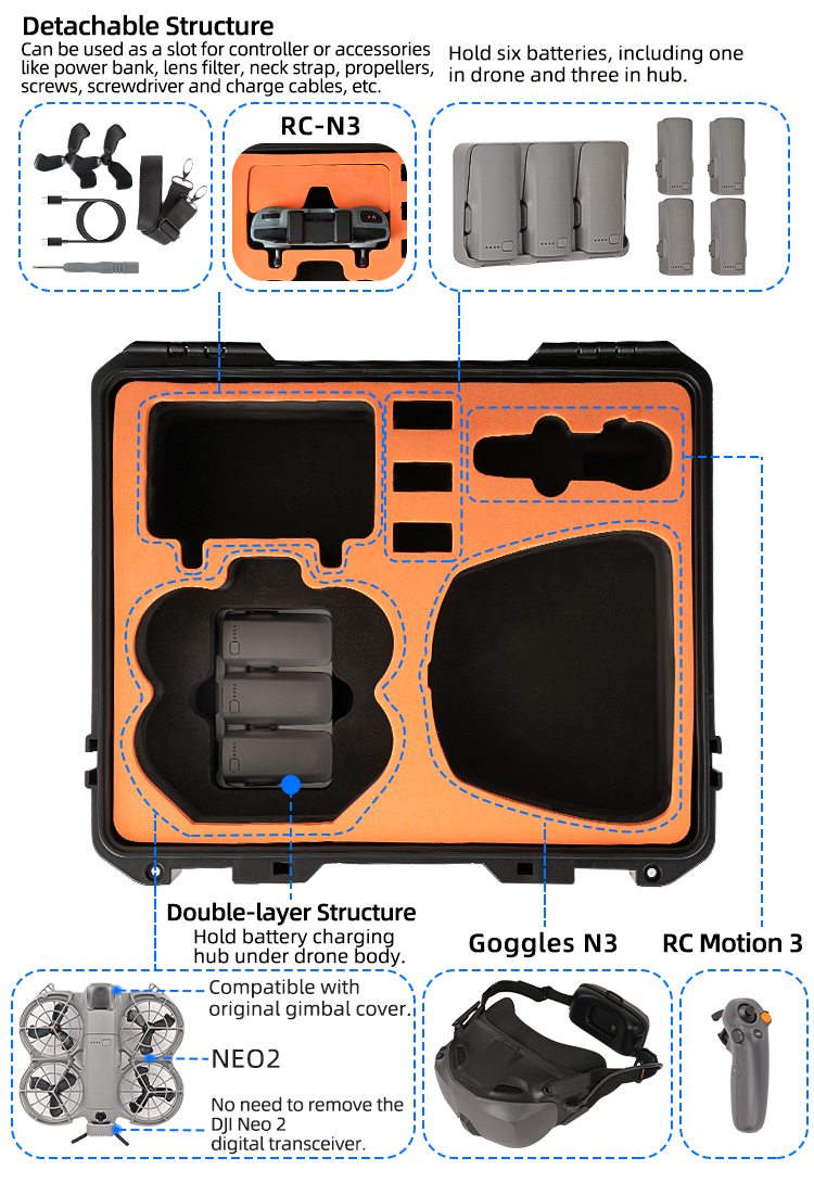 - Large Capacity Case: it can hold drone, battery charging hub, 6 batteries (including one in drone and three in hub), RC Motion 3, Goggles N3, etc.