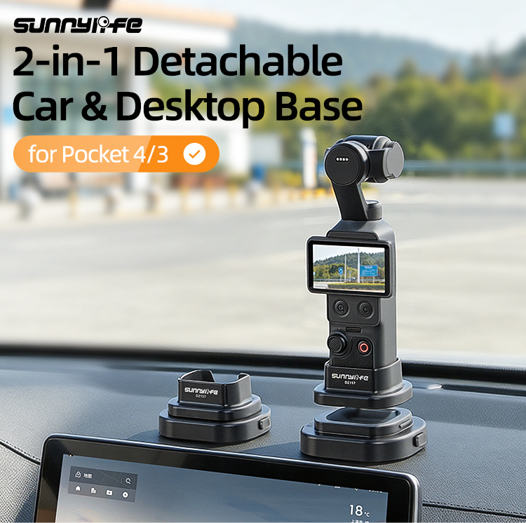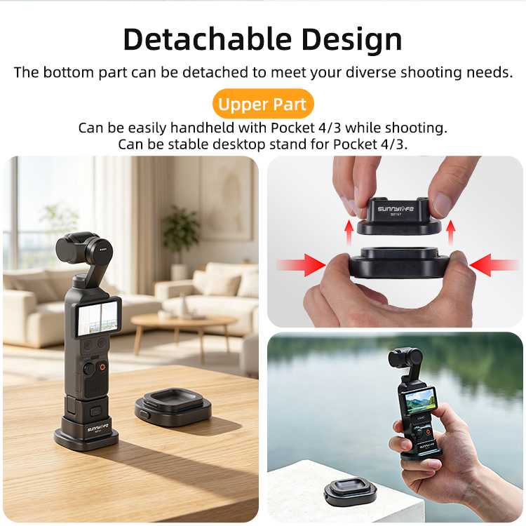 - Detachable Design. The bottom part can be detached to meet your diverse shooting needs. The upper part can be stable desktop stand for Pocket 4/3, and the lower part comes with self-adhesive backing and you can stick it in your car or other surface.