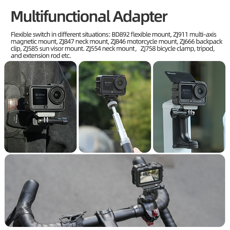 - Flexible switch in different situations: BD892 flexible mount, ZJ911 multi-axis magnetic mount, ZJ847 neck mount, ZJ846 motorcycle mount, ZJ666 backpack clip, ZJ585 sun visor mount. ZJ554 neck mount,ZJ758 bicycle clamp, tripod, and extension rod etc.
