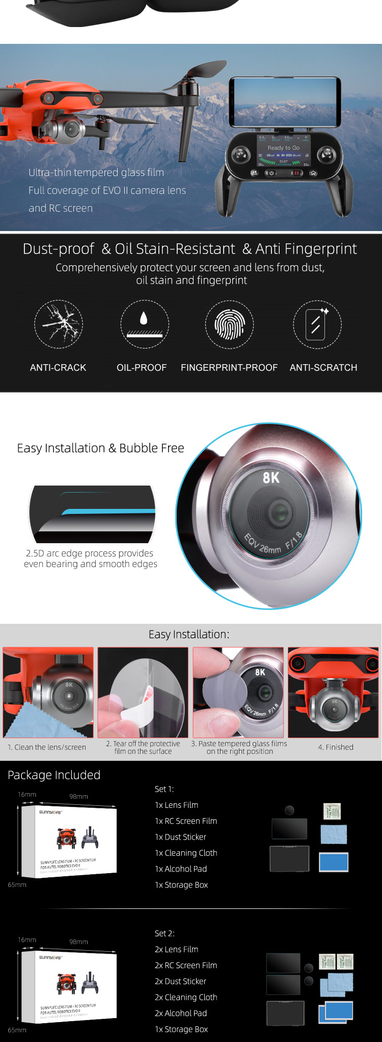 - Set 2: Lens Film(2pcs) + Remote Controller Screen Film(2pcs) Set